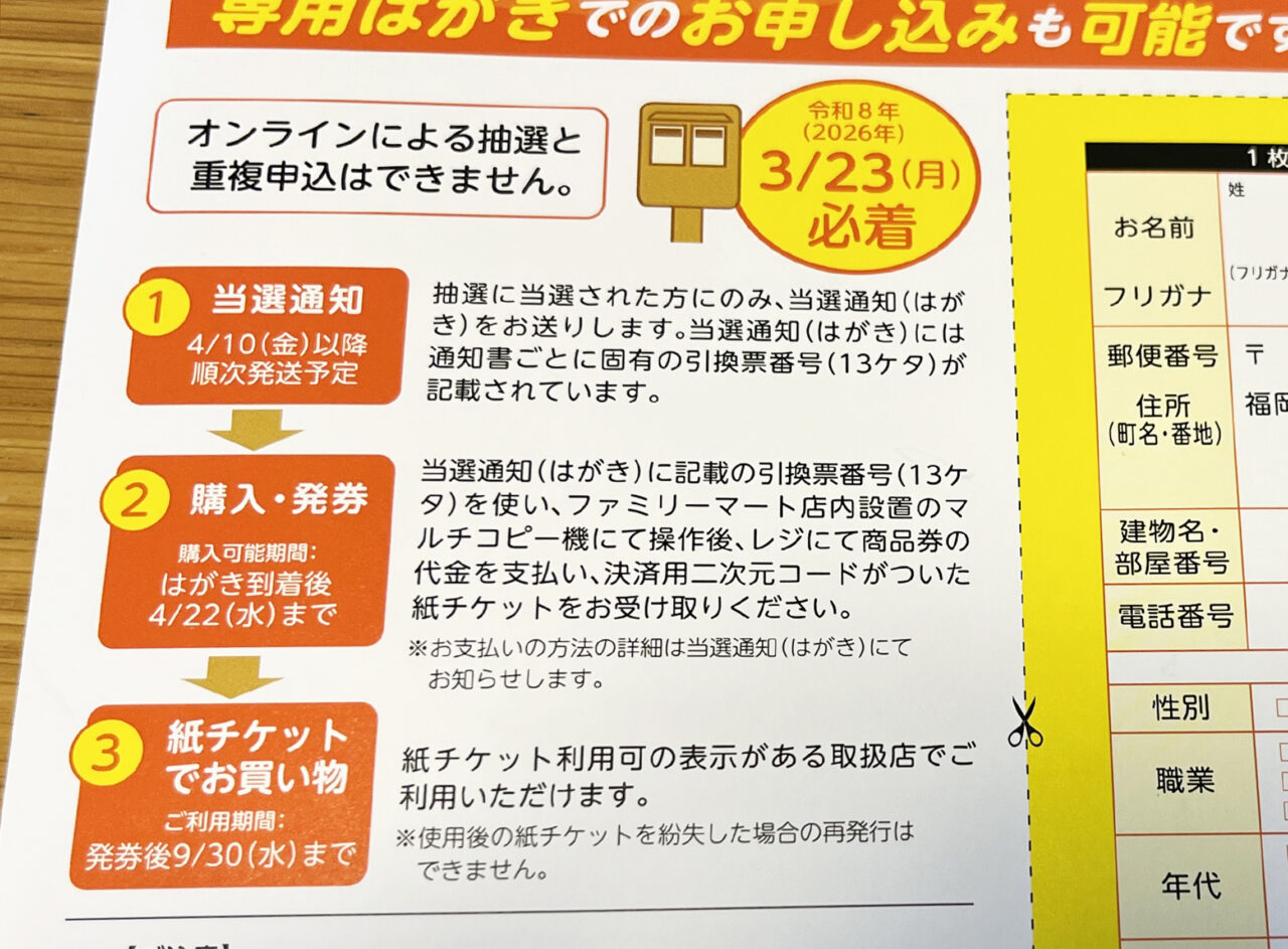 「アプリ決済(WEB申込み)」の方は2026年3月30日よりメールにて連絡され、購入期限は4月17日までとなっていますので、当選された方はご注意下さい。