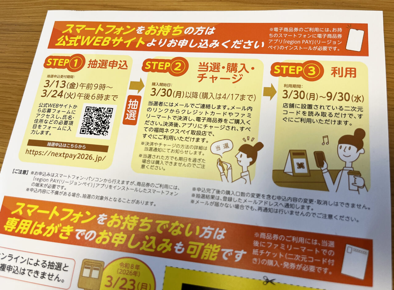 福岡市プレミアム付電子商品券「ネクスペイ」がスタートし、先日抽選結果が発表されましたね。アプリ決済と紙チケットでは発表方法や日時が違い、「紙チケット」の当選通知はがきはまもなく。もう受け取ったという方もいらっしゃるかもしれません。
